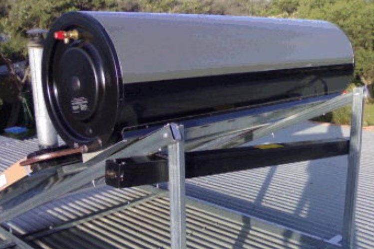 Solar hot water system mounting frames are normally manufactured of anodised aluminum or galvanised steel. The frame has to be strong enough to hold a tank full of water – which is very heavy, particularly if using a 300 litre vitreous enamel tank. (Stainless steel tanks are much lighter than vitreous enamel tanks).